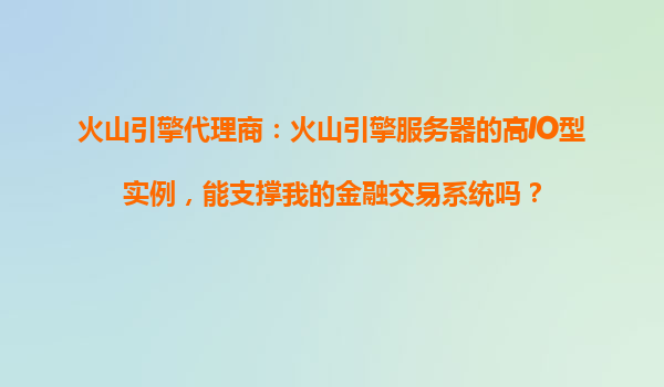 2025-10-22火山引擎代理商解析:火山引擎高IO型實例如何為金融交易系統保駕護航? 一、金融交易系統的核心需求與挑戰 金融交易系統對服務器的要求極為嚴苛,尤其是高頻交易、實時清算等場景,...